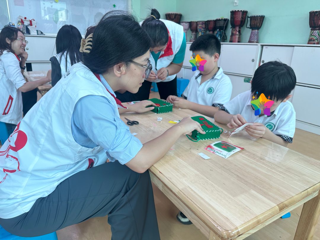 在志愿者一对一的耐心指导和帮助下,孩子们兴致勃勃地拿起针线。从穿针引线到缝合布片,从粘贴五角星到固定背带,每一个步骤都充满了新奇与挑战。志愿者们手把手地教,孩子们专注地学,虽然针脚略显稚嫩,但每一针每一线都凝聚着认真与情感。小小的“红军包”逐渐在孩子们手中成型,鲜红的五角星和“为人民服务”字样格外醒目。当孩子们背上自己亲手制作的小小红军包时,脸上洋溢出自豪和开心的笑容。这不仅是一个手工作品,更是一份对革命先辈的朴素敬意,一次深刻的爱国主义情感体验。
